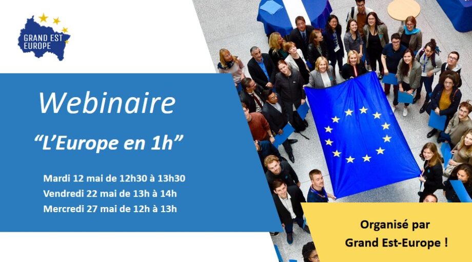 À l’occasion du mois de l’Europe, Grand Est-Europe organise pour la troisième année consécutive ses webinaires « L’Europe en 1h », ouverts au grand public. Trois sessions sont programmées :