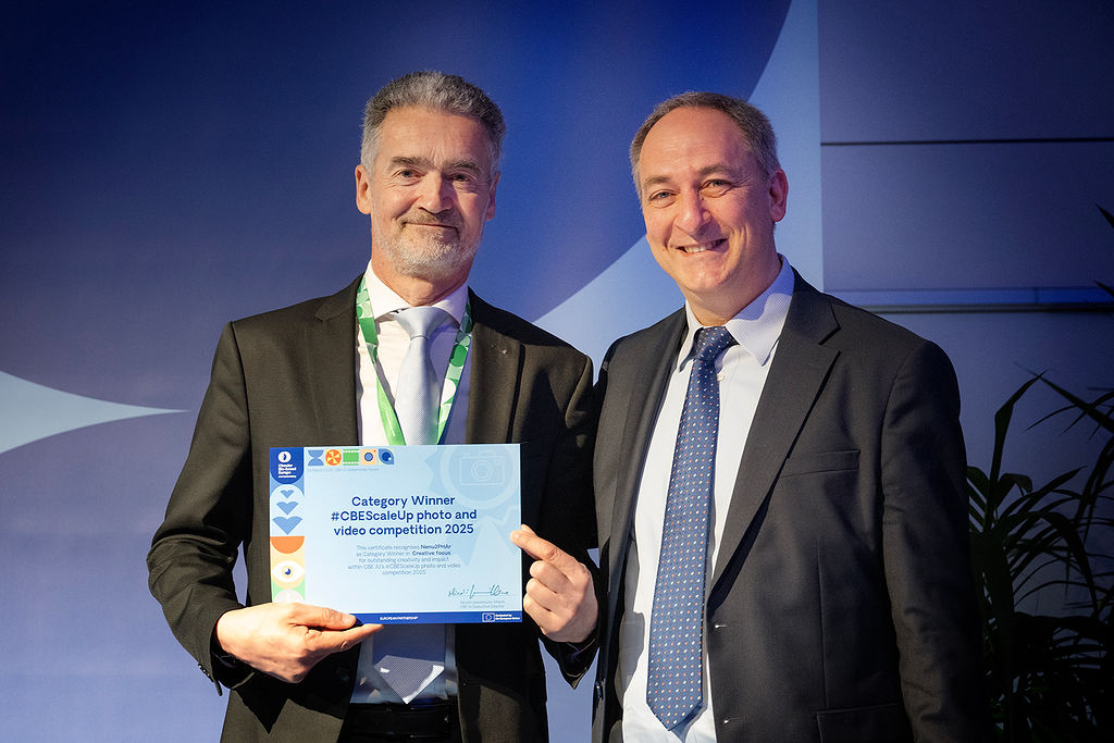 Christophe Luguel, EU Affairs Director – B4C a reçu le prix au nom du projet de la part du Nicolo Giaccomuzzi-Moore, Executive Director © CBE JU